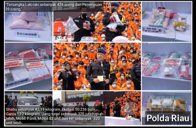 Lanjut Kapolda Riau, Irjen Pol Agung Setya Imam Efendi, SIK yang didampingi Dir Resnarkoba Kombes Victor, Dansat Brimob Kombes Deddy dan Kabid Humas Kombes Narto mengatakan, bahwa dari hasil operasi antik yang telah dilaksanakan Polda Riau sejak 18 Februari sampai 11 Maret 2021, atau selama 22 hari, Polda Riau telah berhasil menangkap Shabu sebanyak 42,19 kilogram, Ekstasi 50.236 butir, Ganja 1,12 kilogram, Uang tunai sebanyak 325 juta rupiah lebih, Mobil 9 unit, Motor 83 unit dan HP sebanyak 320 unit lebih.