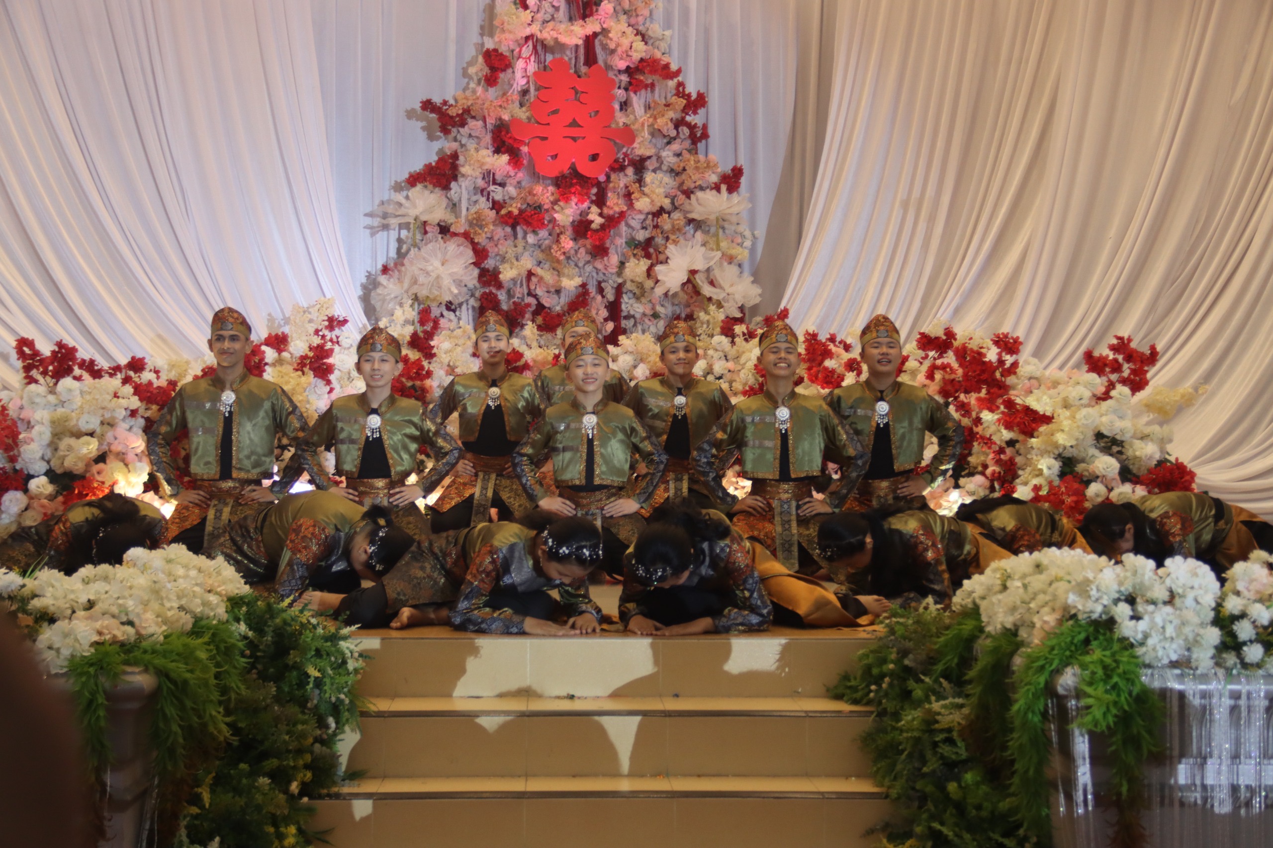 Resepsi pernikahan berlangsung dengan penuh kehangatan dan sukacita, diiringi hiburan musik serta jamuan makan malam bagi para tamu undangan.