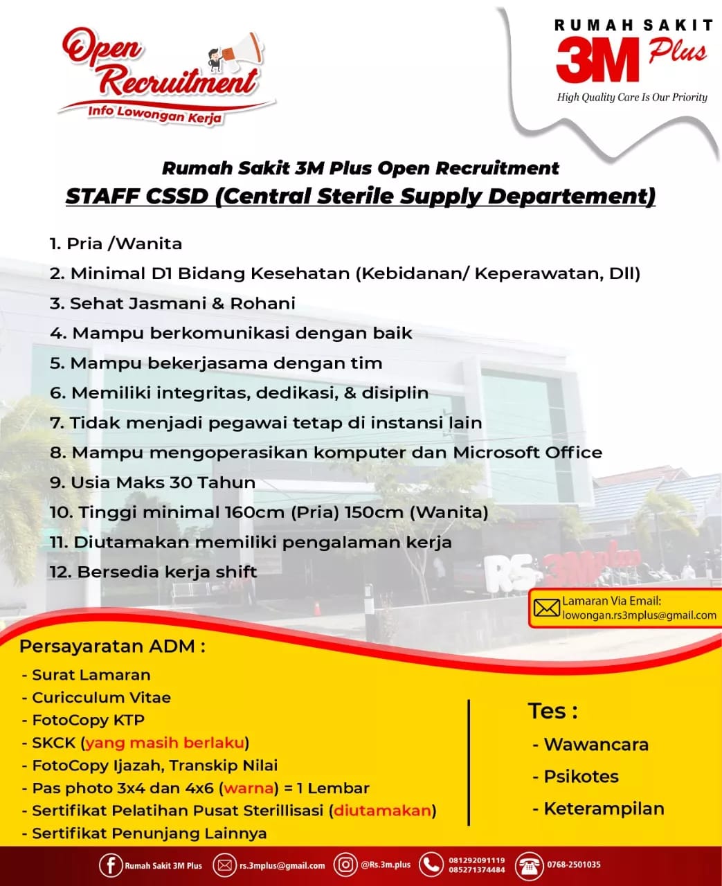 Berkas lamaran dapat dikirim melalui alamat email : lowongan.rs3mplus@gmail.com