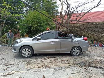 Walau mobil rusak parah, beruntung pengendaranya masih dalam kondisi baik-baik saja. Pohon berukuran besar tersebut hanya menimpa bagian belakang mobil hingga ringsek.