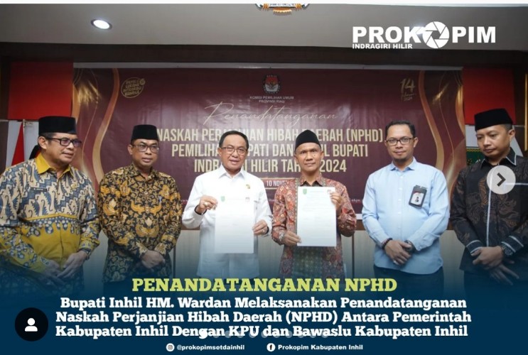 ARB INdonesia, INDRAGIRI HILIR – Bupati Kabupaten Indragiri Hilir (Inhil) HM Wardan melaksanakan penandatanganan Naskah Perjanjian Hibah Daerah (NPHD) antara Pemerintah Kabupaten Inhil dengan KPU dan Bawaslu Inhil, Jum’at (10/11/2023) disaksikan oleh K9etua KPU Provinsi Riau Ilham Muhammad Yasir.