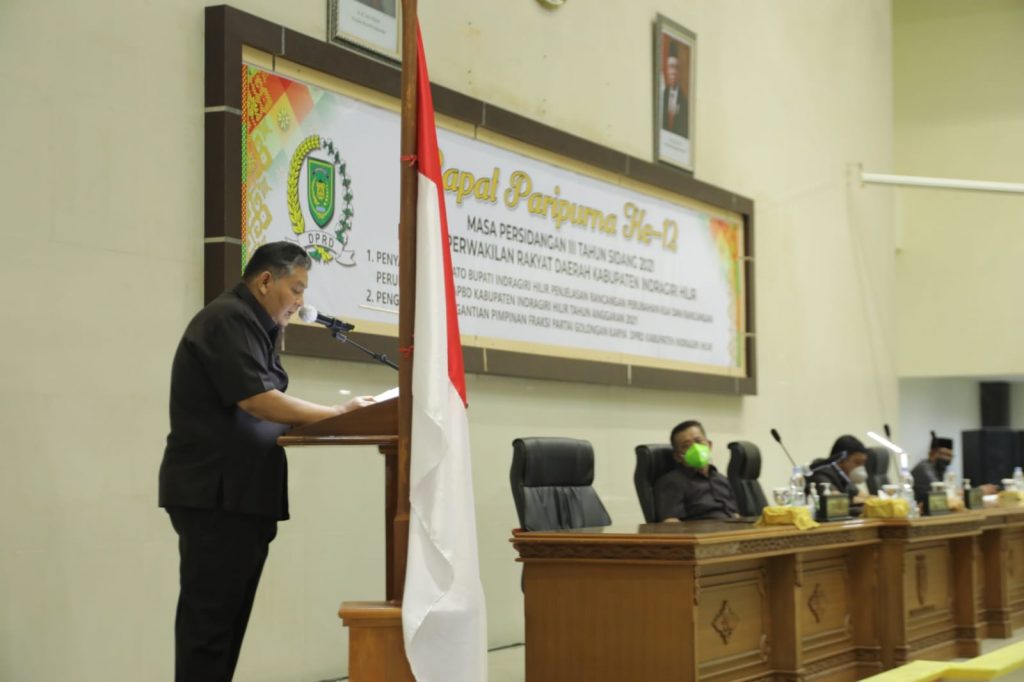 Pada rapat paripurna itu, Sekretaris Daerah Kabupaten Indragiri Hilir, Drs H Afrizal MP hadir mewakili bupati untuk menyampaikan pidatonya dihadapan forum rapat yang dipimpin Wakil Ketua DPRD Kabupaten Indragiri Hilir, Edi Gunawan SE MSi.