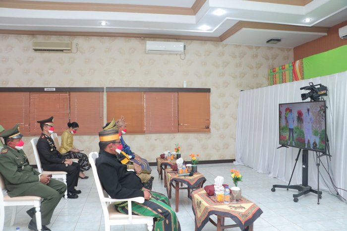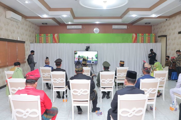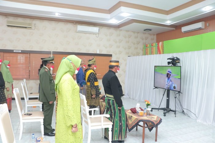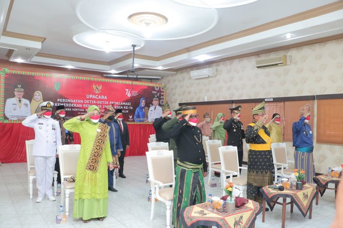 Usai apel upacara di lapangan Kantor Bupati, Bupati beserta Wakil Bupati Inhil dan unsur Pimpinan Forkopimda melanjutkan upacara detik-detik proklamasi dari Istana Negara secara virtual. (Adv/Galeri foto)