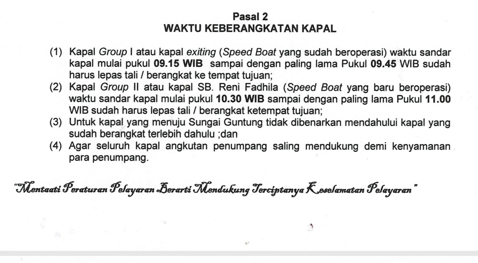 Didalam ketentuan pada Surat Keputusan (SK) Kepala KSOP TTembilahan pada pasal 2 ayat 2, kapal grub II atau kapal SB Reni Fadhila (speed boat yang baru beroperasi) waktu sandar kapal mulai pukul 10.30 Wib sampai dengan dengan paling lama pukul 11.00 Wib sudah harus lepas tali atau berangkat ketempat tujuan.