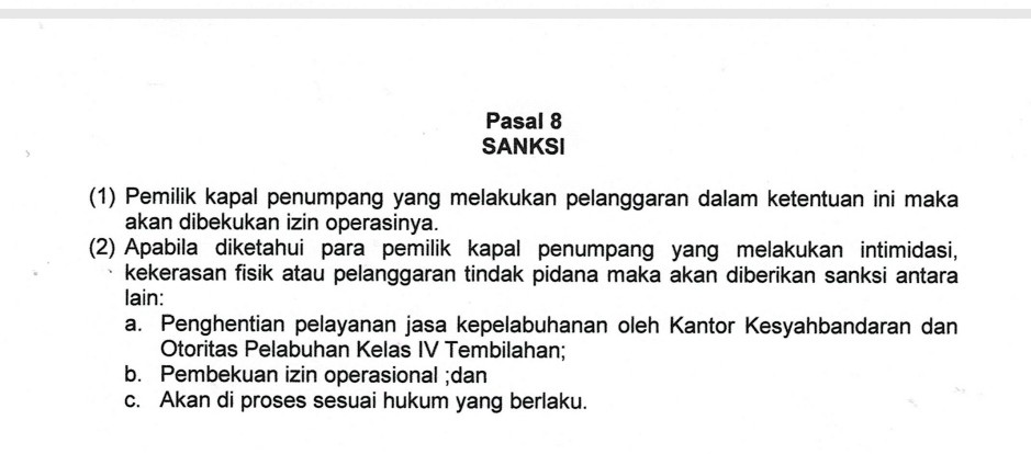 “Itu yang bicara bukan saya aturan yang mereka buat sendiri (KSOP) yang tertuang pada pasal 8 tentang sanksi ayat 1, yaitu dibekukan izin operasinya bagi pemilik kapal yang melakukan pelanggaran dalam ketentuan ini,” tambahnya lagi.