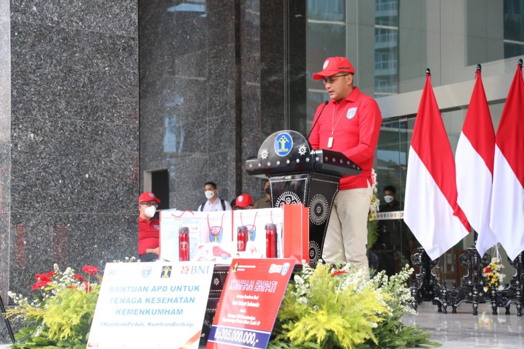 Pada kesempatan tersebut, Kemenkumham yang diwakili oleh Direktur Perawatan Kesehatan dan Rehabilitasi Ditjen Pemasyarakatan, Muji Raharjo menyerahkan 1.000 paket kelengkapan adaptasi kebiasaan baru. Prosesi penyerahan ini disaksikan pula secara langsung dari Selasar Gedung AHU Kemenkumham.